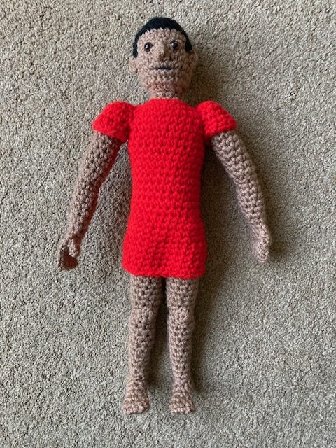 This was a special commission for someone who loves puffins and chocolate oranges. The challenge was to make the chocolate orange part-unwrapped. Since none of my yarn was the right colour for the orange wrapper – one too orange and one too yellow – I used both! I crocheted as though using a single yarn and just hooked both at the same time. The result was the colour I wanted but with an added bonus that the different colours mixed together gave a slightly metallic shine to it. Then, I attached a silver yarn to the inside and crocheted that layer too. The chocolate itself I simply crocheted as a ball and inserted into the wrapper. Happy eating, Terry the Puffin!